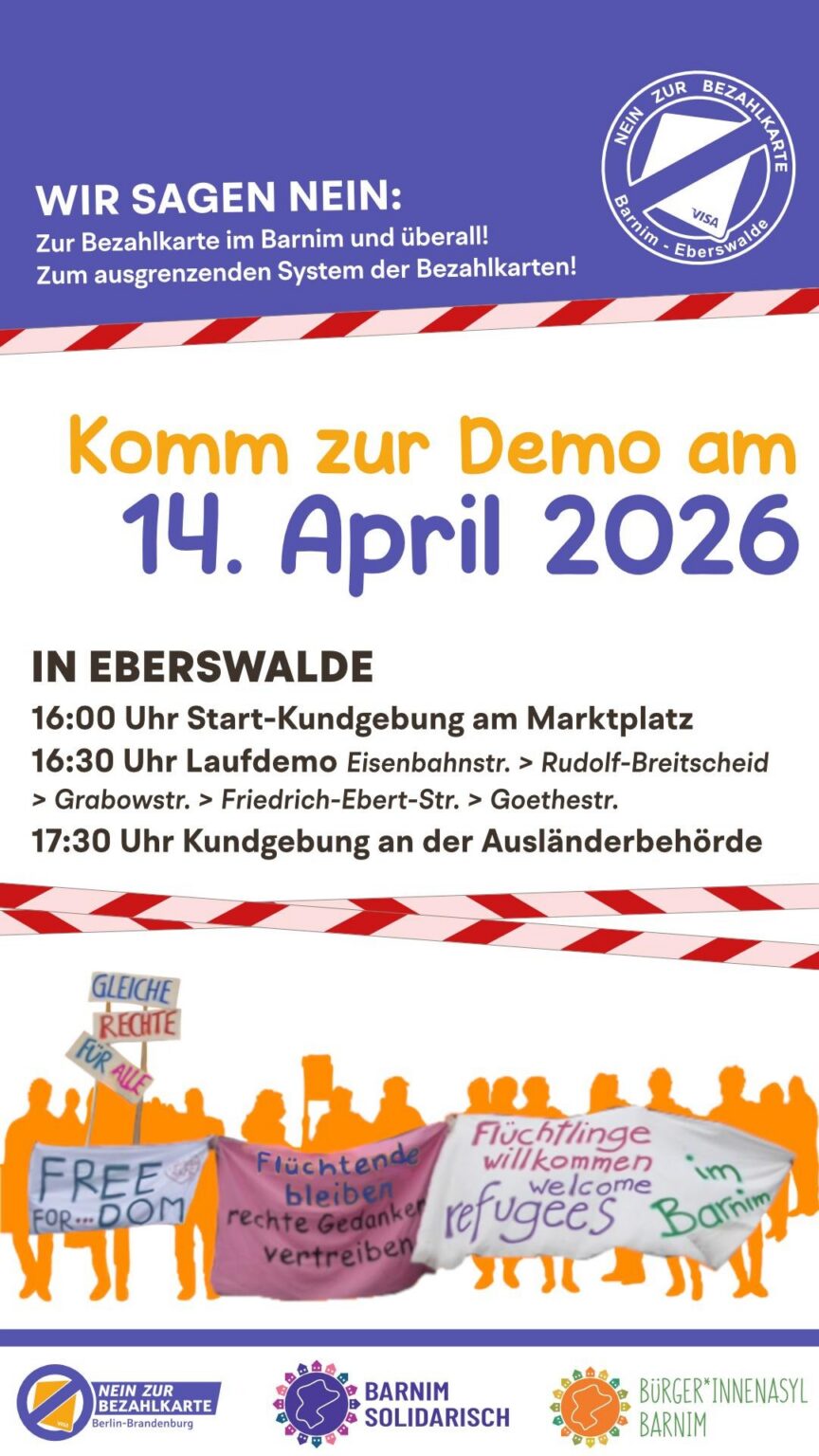 05 лютого: Широкий альянс громадянського суспільства в Барнімі закликає до солідарності та створення мереж у публічній заяві. Бажаєте підтримати нас, наприклад, пожертвувавши кошти або обмінявшись ваучерами? Тоді зв’яжіться з нами за адресою: nein-zur-bezahlkarte-barnim [ät] posteo [dot] de